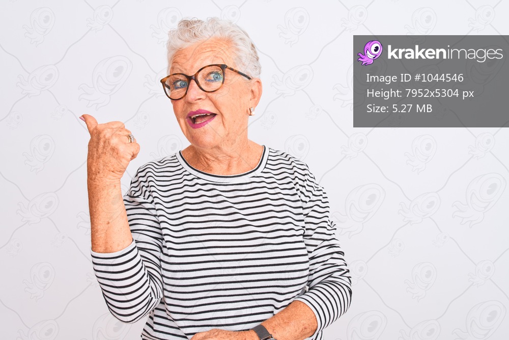 Senior grey-haired woman wearing striped navy t-shirt glasses over isolated white background smiling with happy face looking and pointing to the side with thumb up. - Kraken Images
