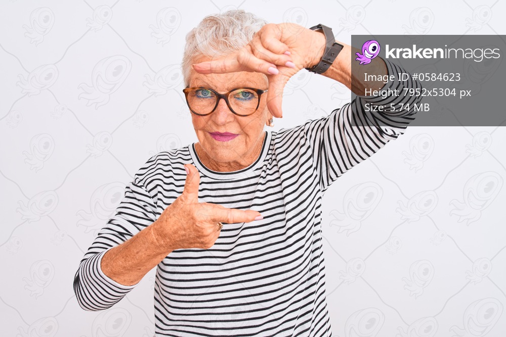 Senior grey-haired woman wearing striped navy t-shirt glasses over isolated white background smiling making frame with hands and fingers with happy face. Creativity and photography concept. - Kraken Images