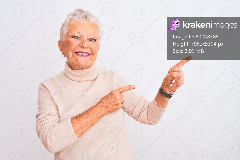 Senior grey-haired woman wearing turtleneck sweater standing over isolated white background smiling and looking at the camera pointing with two hands and fingers to the side. - Kraken Images