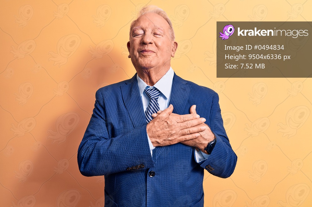 Senior handsome grey-haired businessman wearing elegant suit over yellow background smiling with hands on chest, eyes closed with grateful gesture on face. Health concept. - Kraken Images