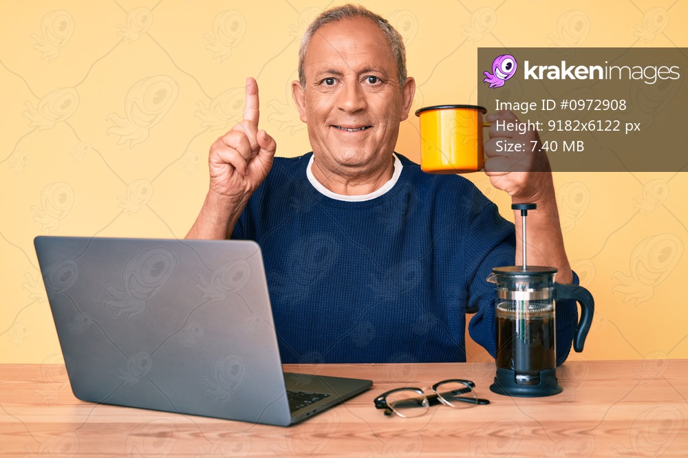 Senior handsome man with gray hair working at the office drinking a cup of coffee smiling with an idea or question pointing finger with happy face, number one - Kraken Images