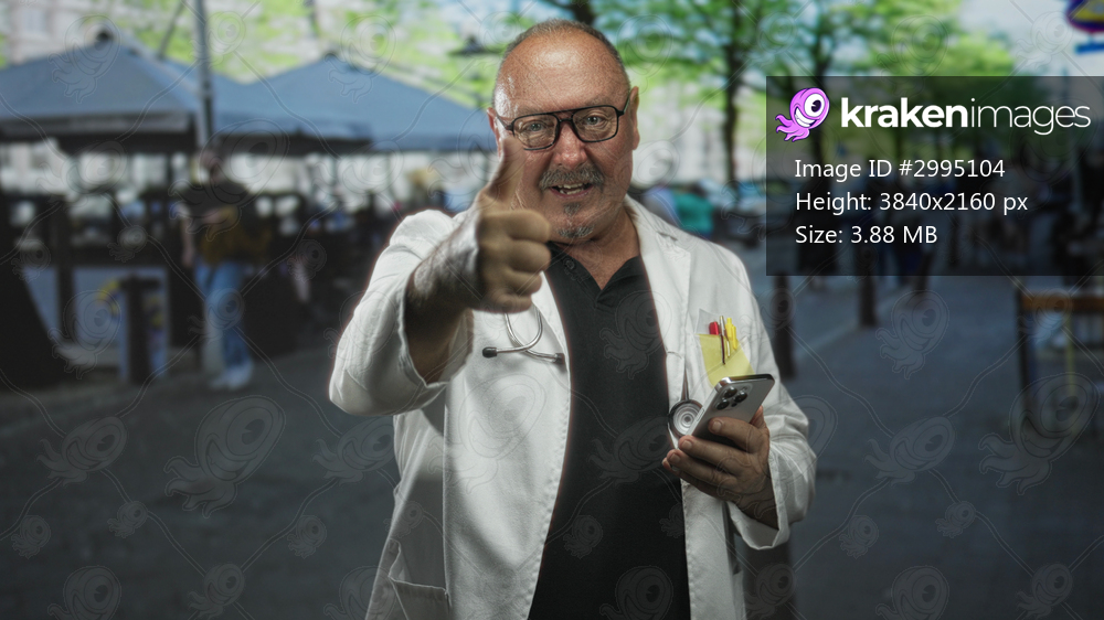 Senior hispanic doctor in white coat holding smartphone and stethoscope gives thumbs up on busy street; confidence.