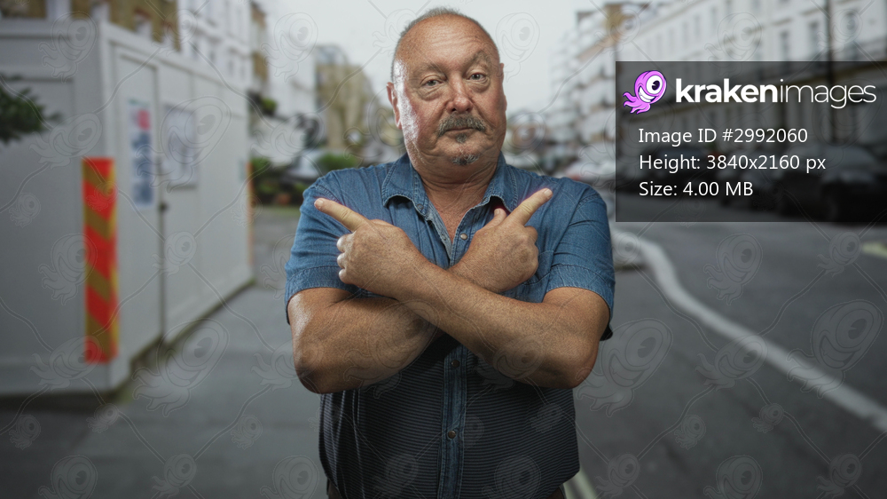 Senior hispanic man with crossed arms pointing fingers across chest in a denim shirt on a city street; confusion.
