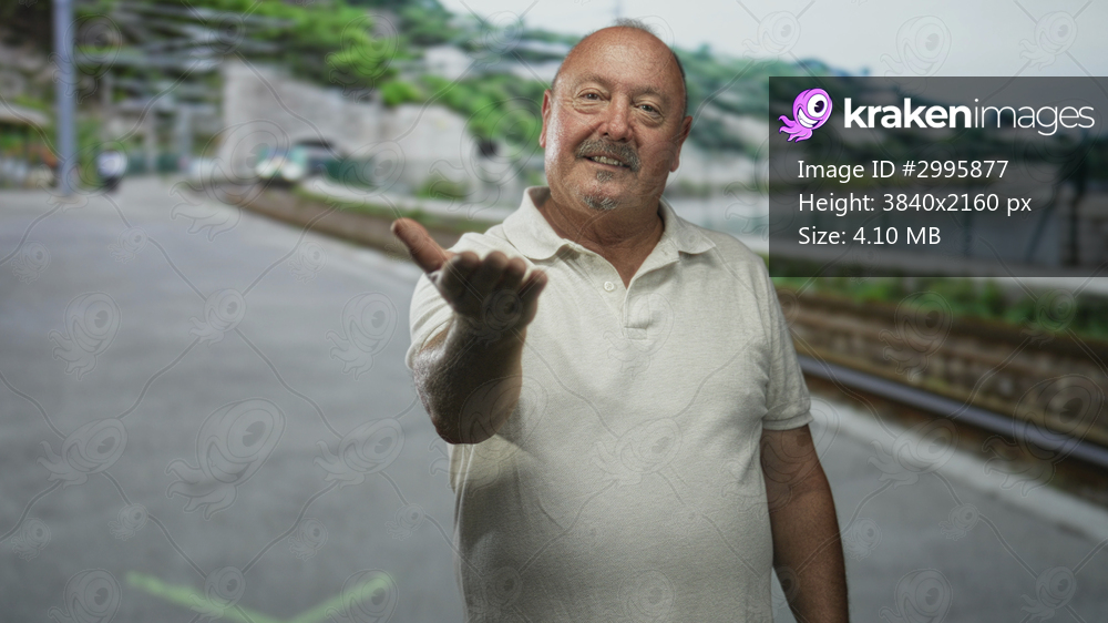Senior hispanic man extends open hand palm up in offering gesture on a train station platform by train tracks, wearing a light polo shirt; welcoming invitation. - Kraken Images