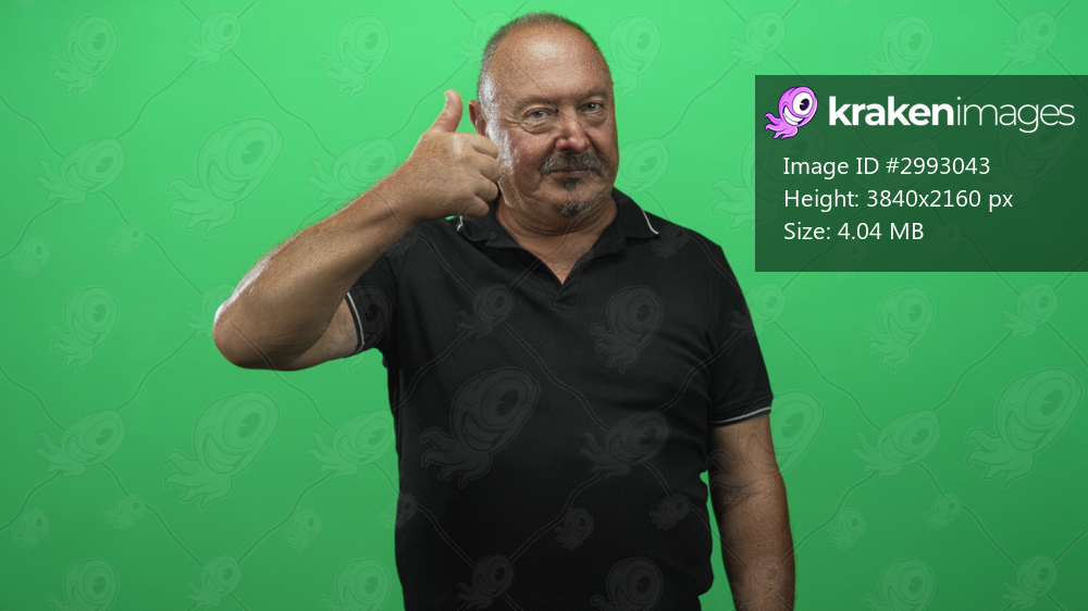 Senior hispanic man giving thumbs up with right hand extended wearing a black polo against a green studio backdrop; approval confidence warmth.