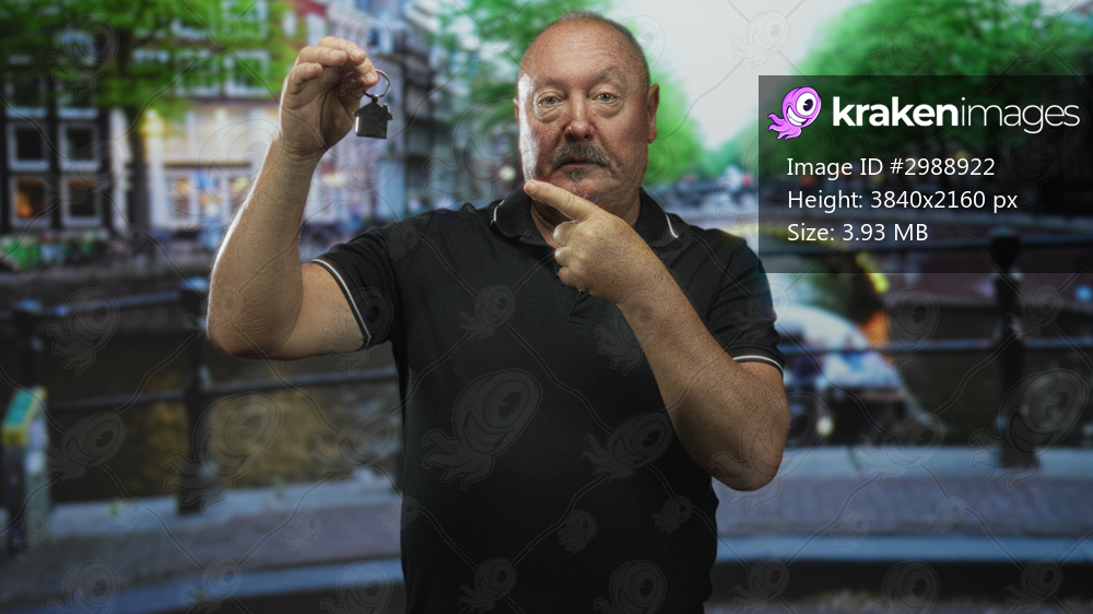 Senior hispanic man holding a house shaped keychain and keys, pointing finger at keys while standing in a black polo shirt before a canal bridge backdrop in a studio; homeownership pride. - Kraken Images