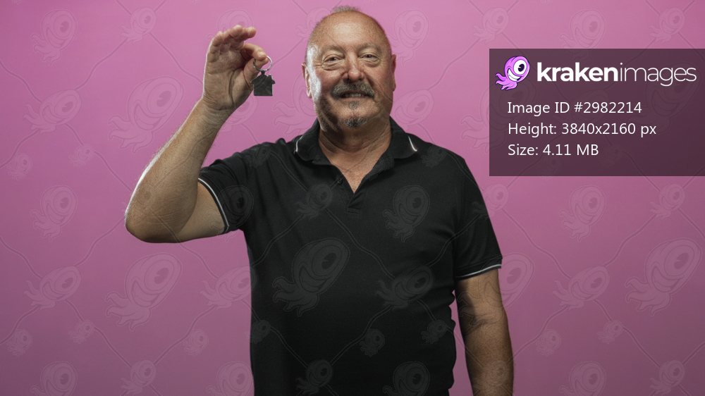 Senior hispanic man holding house keychain in raised right hand in studio pink backdrop wearing black polo shirt; homeownership pride.