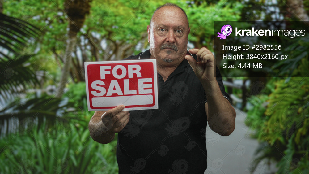 Senior hispanic man holding red for sale sign and pinches fingers on a forest walkway with lush green plants; confidence trust.