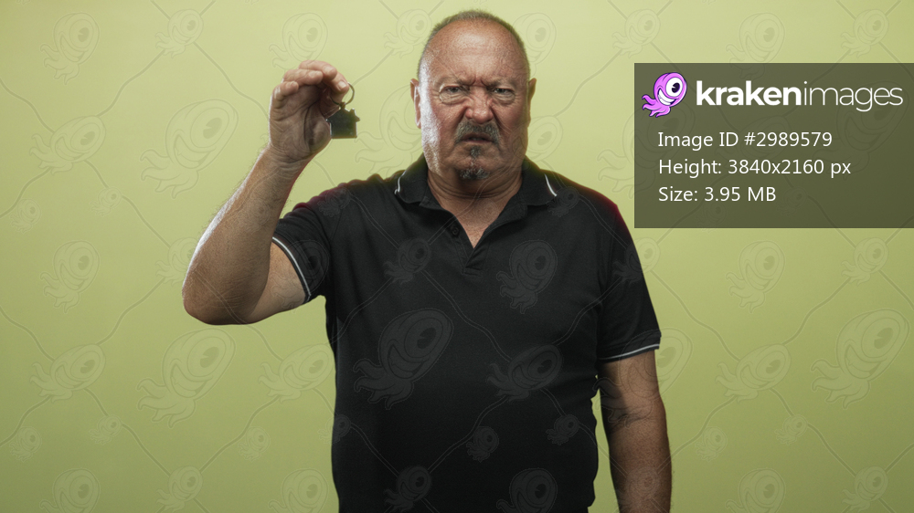 Senior hispanic man holds a house key fob between thumb and forefinger, arm raised and scowling in studio; frustration homeownership security.