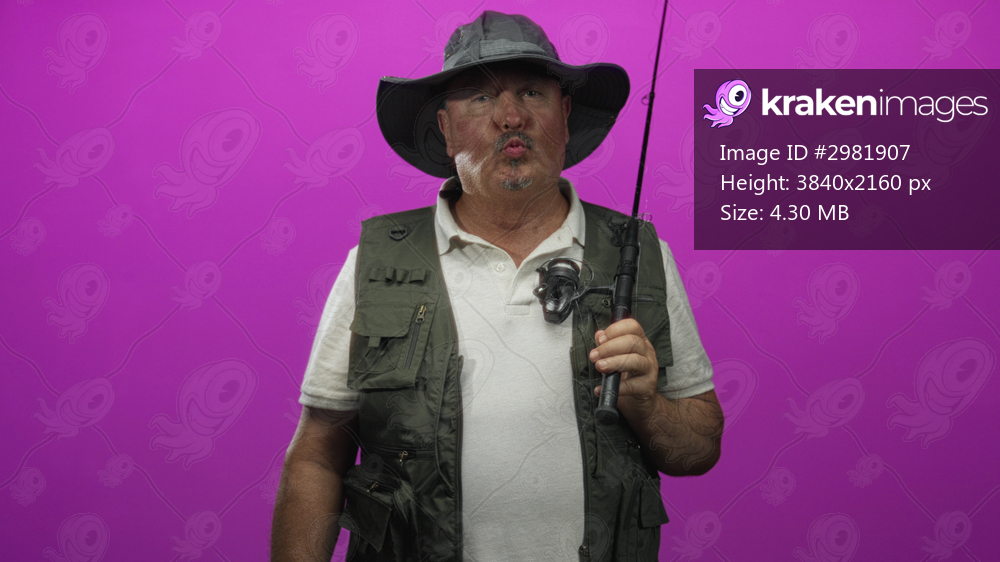 Senior hispanic man holds fishing rod and wears green fishing vest and wide brim hat, smiling and facing forward in studio; hobby leisure serenity.