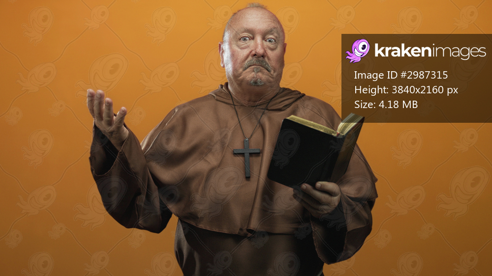 Senior hispanic man monk holds bible and shows thumbs up gesture in studio wearing brown robe and wood cross pendant; serenity.