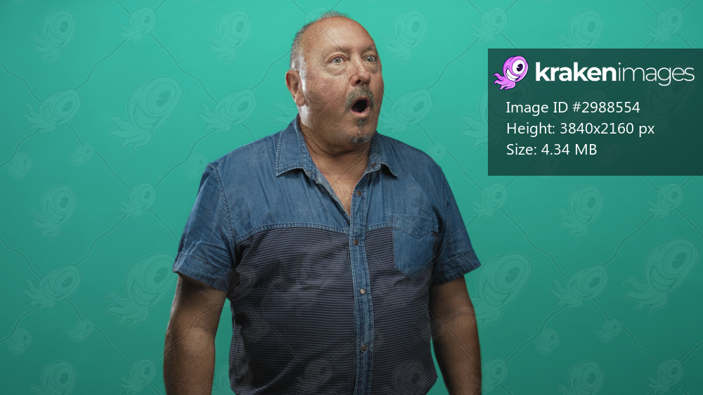 Senior hispanic man with open mouth gasp and visible bare neck wearing denim shirt, turned profile against teal studio backdrop; surprise reaction.