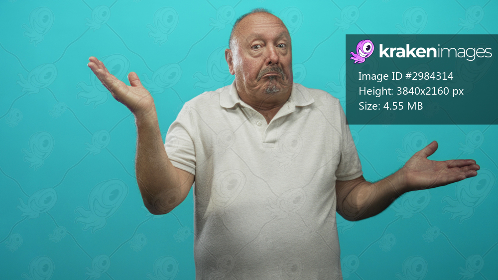 Senior hispanic man with palms up shrug gesture, wearing white polo shirt against teal studio backdrop, puzzled face; uncertainty doubt.