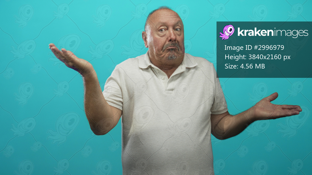 Senior hispanic man with palms up shrug gesture, wearing white polo shirt against teal studio backdrop, puzzled face; uncertainty doubt.