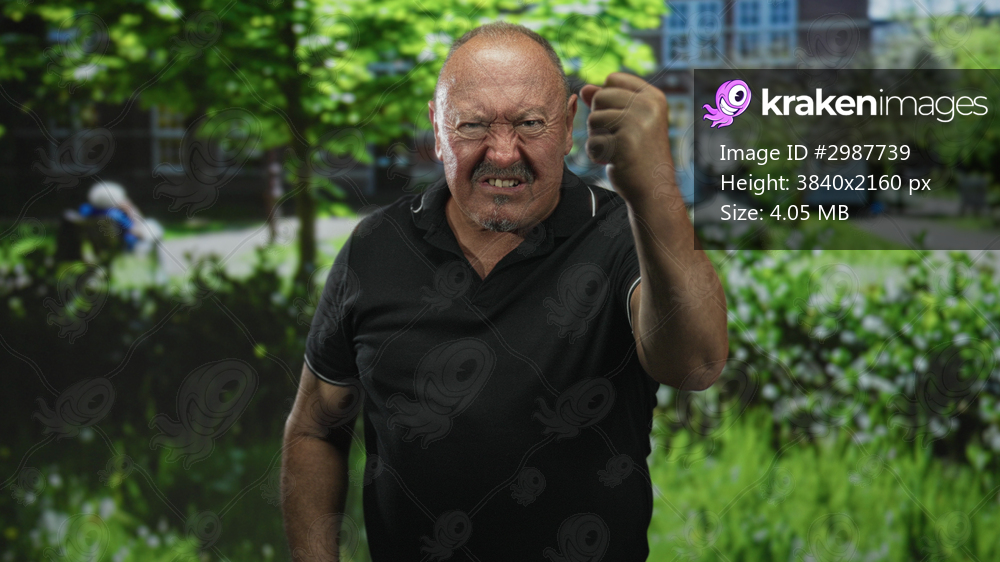 Senior hispanic man raises clenched fist and bares knuckles in front of building entrance, scowling and grimacing at camera; anger defiance.