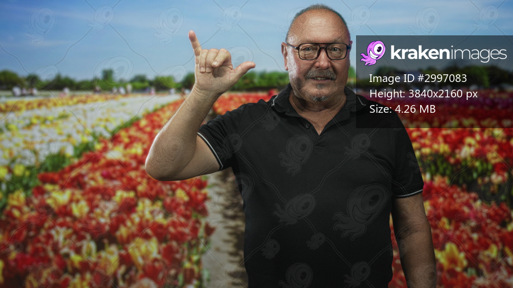 Senior hispanic man wearing black polo and glasses showing thumbs up with right hand in studio with tulip field backdrop; optimism greeting.