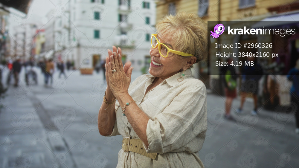 Senior hispanic woman clapping hands on a busy pedestrian street, wearing yellow glasses and a beige belted dress, smiling broadly; celebration joy.