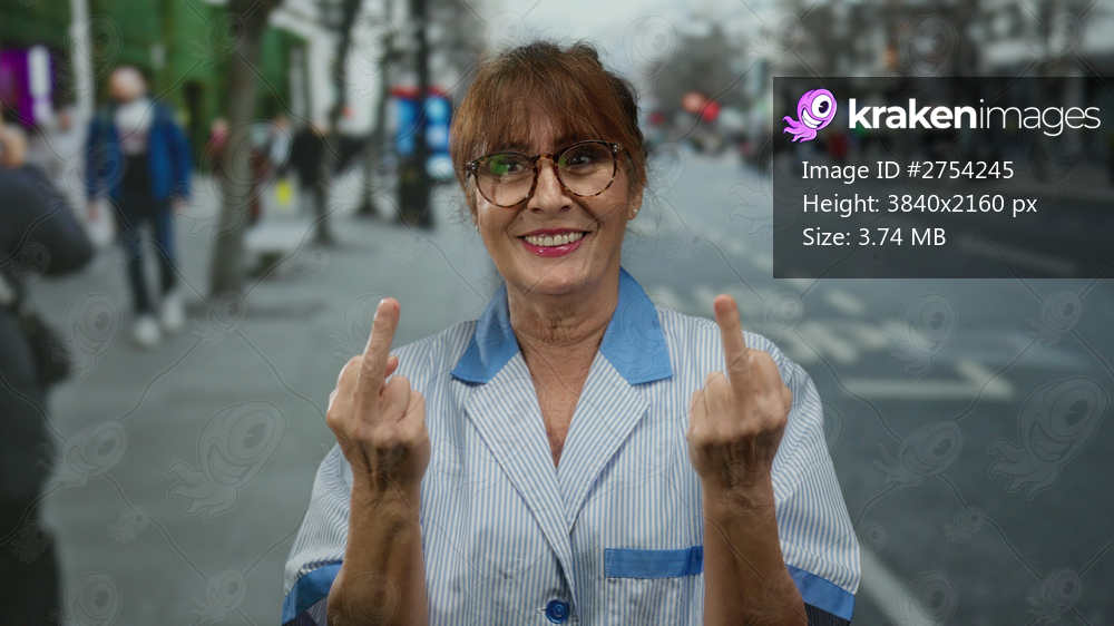Senior hispanic woman cleaner on city street making gesture with middle fingers in defiant expression surrounded by urban environment outdoors.