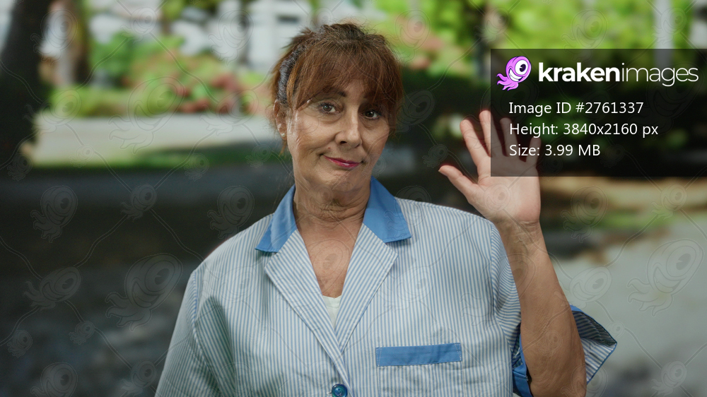 Senior hispanic woman cleaner smiling while gesturing in a park, wearing a uniform outdoors during a sunny day.