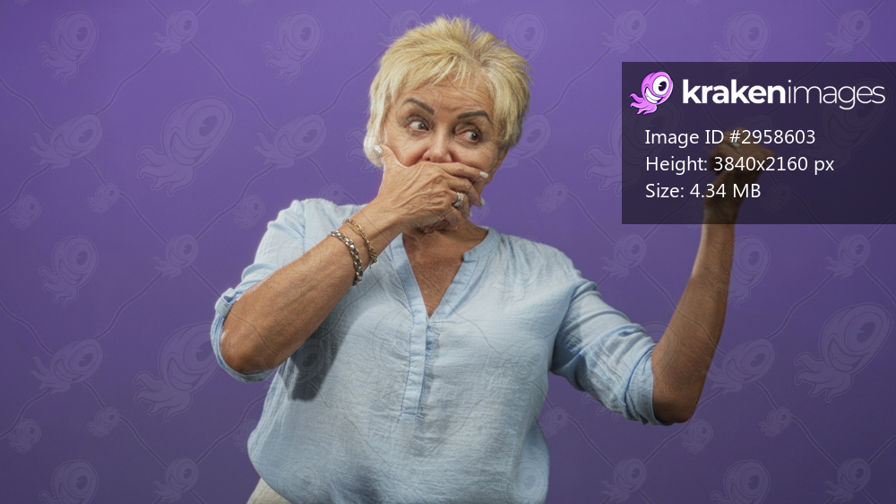 Senior hispanic woman covering mouth with hand and raising fist against purple studio backdrop; surprise secrecy.
