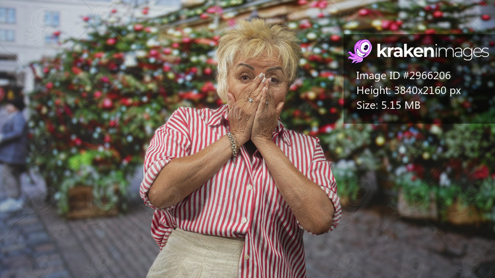 Senior hispanic woman covers mouth with hands in street by a large decorated christmas tree and ornaments; surprise nostalgia.