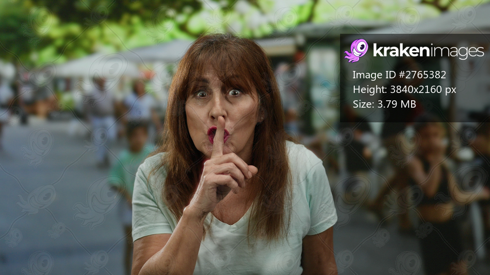 Senior hispanic woman expressing emotions on a lively city street terrace with people enjoying an outdoor restaurant setting shaded by trees during a sunny day. - Kraken Images