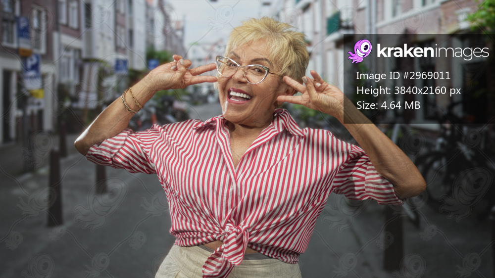 Senior hispanic woman flashes v sign with both hands near face, smiling, wearing red striped tied shirt and white glasses on a narrow street; joyful playfulness. - Kraken Images
