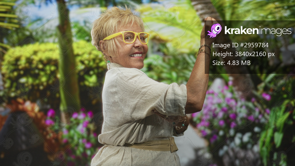 Senior hispanic woman flexes bicep and smiles, wearing yellow glasses, beaded bracelets and a light linen dress in studio with lush tropical backdrop; confidence. - Kraken Images