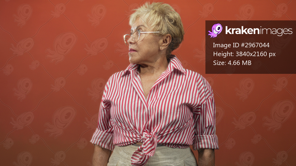Senior hispanic woman gazing sideways, wearing glasses and a knotted red striped shirt, standing against a solid orange studio backdrop with relaxed posture; reflective dignity. - Kraken Images