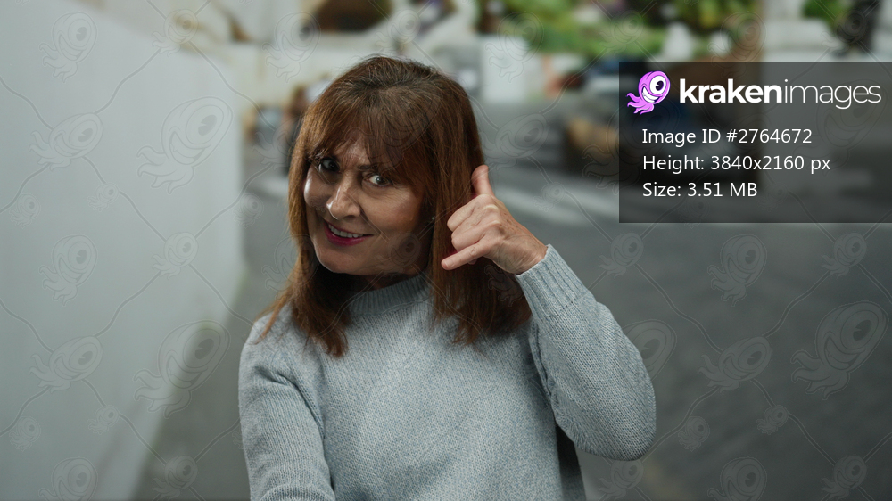 Senior hispanic woman gestures on a city street, playfully pointing and miming a phone call, conveying humor and connection in an outdoor urban setting. - Kraken Images