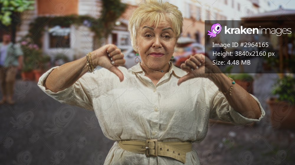 Senior hispanic woman gives two thumbs down gestures on a cobblestone street near an outdoor cafe, wearing linen dress and belt while smirking; wry disapproval. - Kraken Images