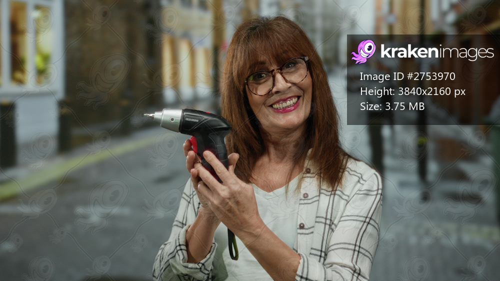 Senior hispanic woman with glasses cheerfully holding a power drill on a city street, wearing a checkered shirt and smiling brightly with buildings in the background. - Kraken Images