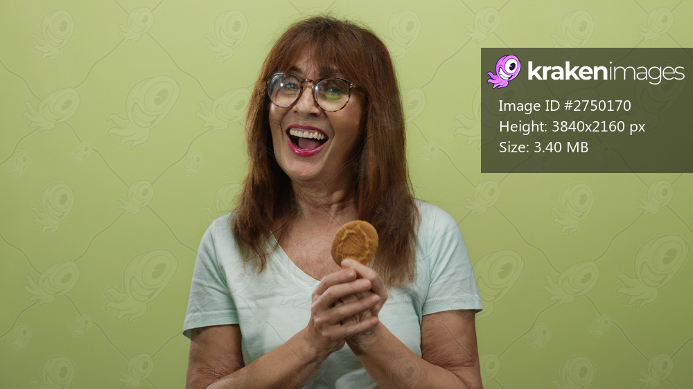 Senior hispanic woman with glasses holding a cookie against a yellow wall, smiling warmly while wearing a white shirt, creating a friendly and inviting atmosphere. - Kraken Images