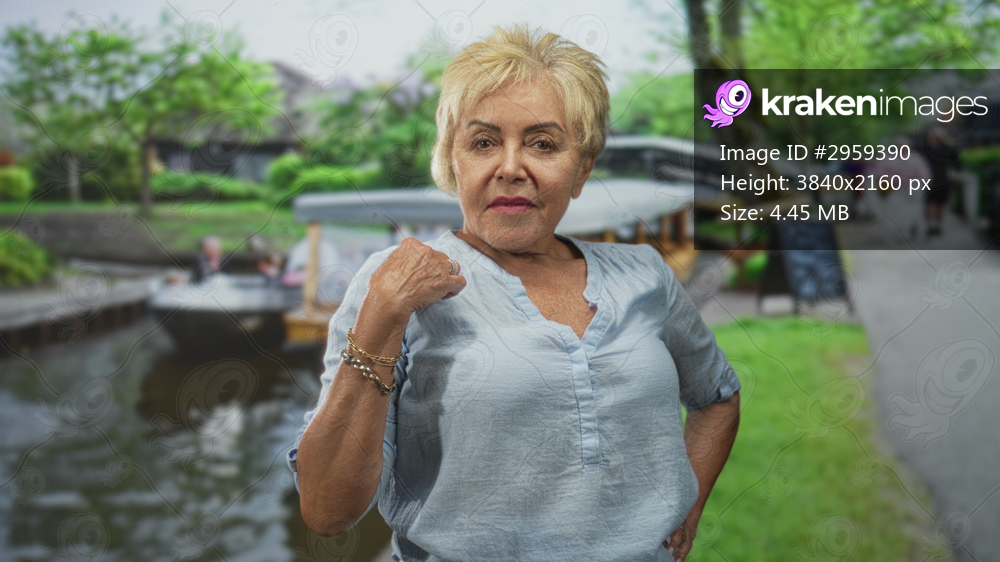 Senior hispanic woman with hand to chest and hand on hip on a street by canal boats and tree lined path; quiet confidence.