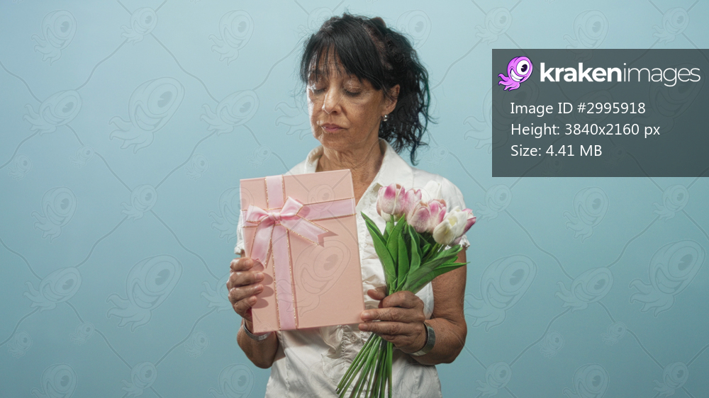 Senior hispanic woman holding a pink gift box tied with ribbon and a bouquet of pink and white tulips, hands visible and wearing white blouse in studio; melancholy reflection. - Kraken Images