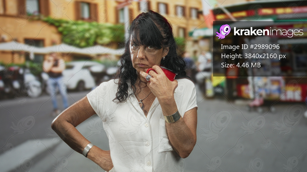Senior hispanic woman holding a red coffee mug, hand to chin, wearing white blouse and silver cuff, standing on a street near a newsstand and outdoor cafe; quiet contemplation. - Kraken Images