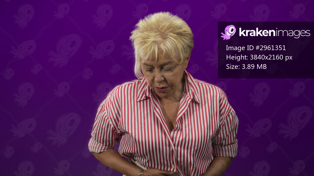 Senior hispanic woman holding abdomen with hands at her waist, eyes closed and bowed head in studio; discomfort concern.