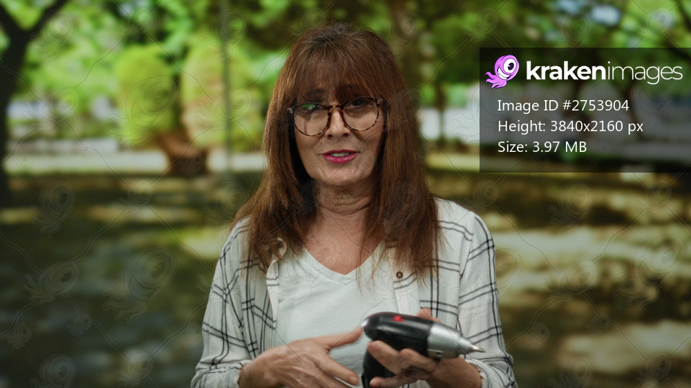 Senior hispanic woman holding drill in park setting with trees, wearing glasses, smiling, demonstrating diy tools in outdoor greenery.