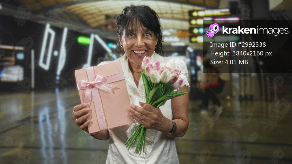Senior hispanic woman holding pink gift and tulip bouquet, hands visible and smiling in airport terminal; joy reunion gratitude.