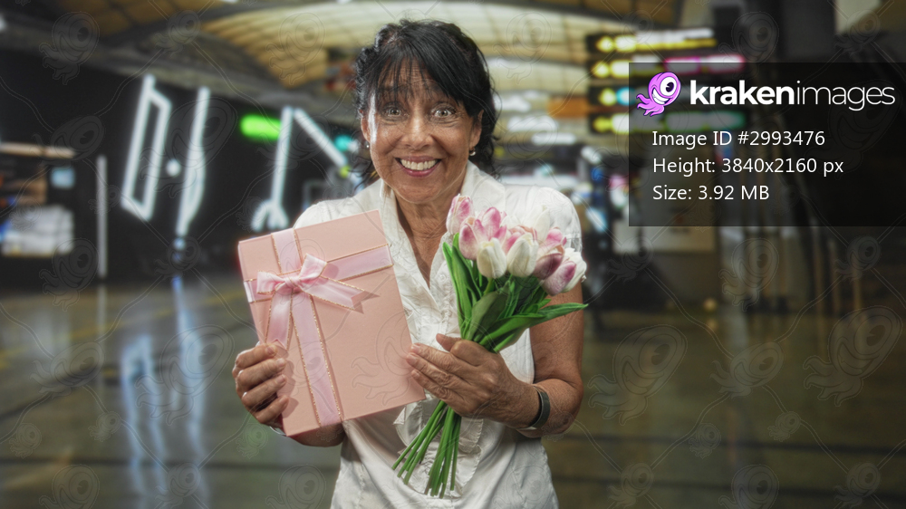 Senior hispanic woman holding pink gift and tulip bouquet, hands visible and smiling in airport terminal; joy reunion gratitude.