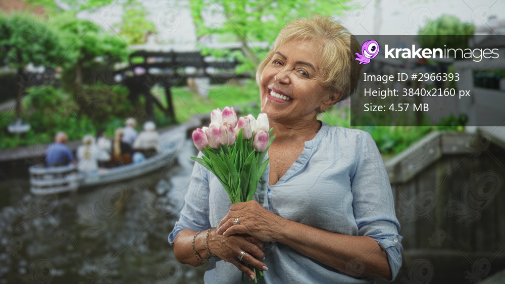 Senior hispanic woman holding pink tulips, smiling while holding bouquet with both hands on street; joy gratitude.