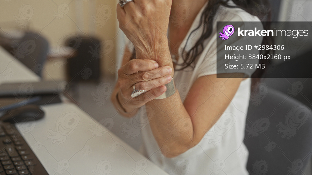 Senior hispanic woman holding wrist at office desk with computer keyboard and paperwork, massaging wrist pain near ring and bracelet; discomfort.