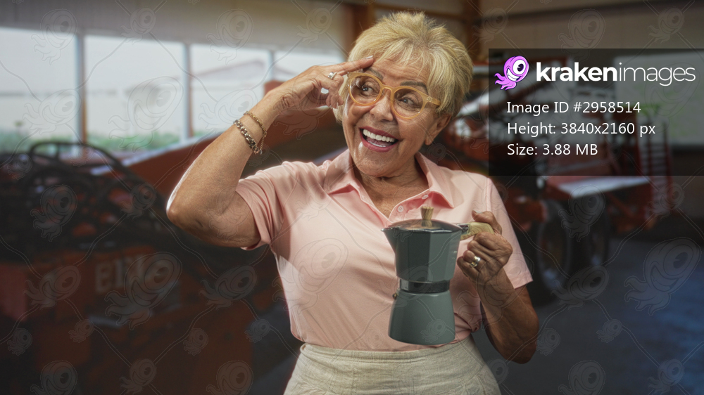 Senior hispanic woman holds a moka pot and points finger to temple while smiling in a farm machinery building, wearing pink polo and glasses; playful confidence. - Kraken Images