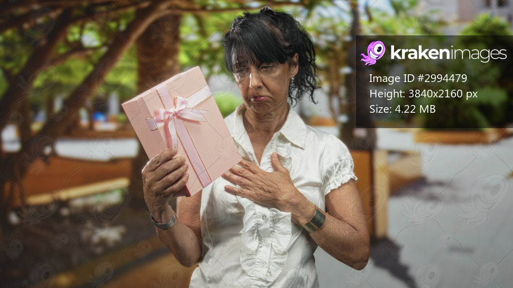 Senior hispanic woman holds pink gift box with hand on chest on street, uncertain expression; melancholy reflection.