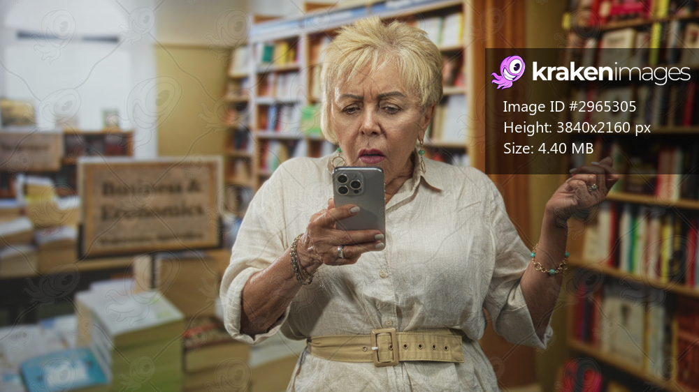 Senior hispanic woman holds smartphone and frowns with hand on hip in bookstore; digital confusion help.