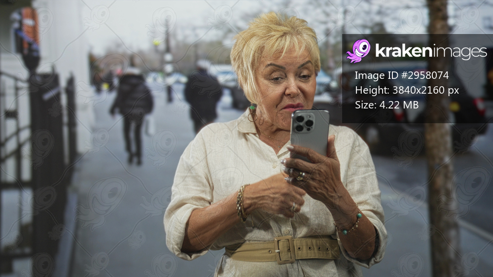 Senior hispanic woman holds smartphone with hand to chest while reading a message on a street; surprise connection.