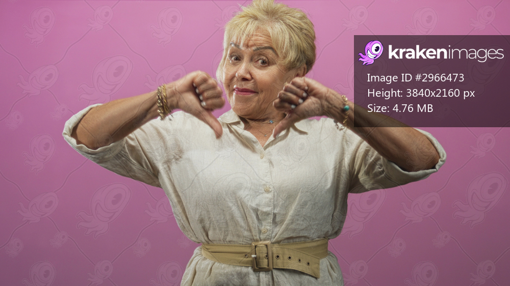 Senior hispanic woman in a belted linen shirt showing thumbs down with visible hands and bracelets in studio; disapproval.