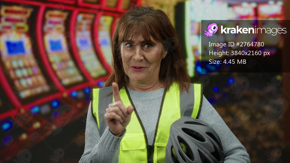 Senior hispanic woman in a reflective vest holding a helmet in a vibrant indoor casino with a background of slot machines and pointing gestures suggest a lively atmosphere - Kraken Images