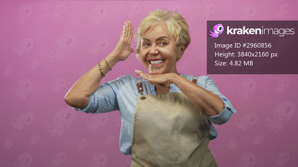 Senior hispanic woman in apron frames face with smiling hands near cheek and chin in studio; joy confidence.