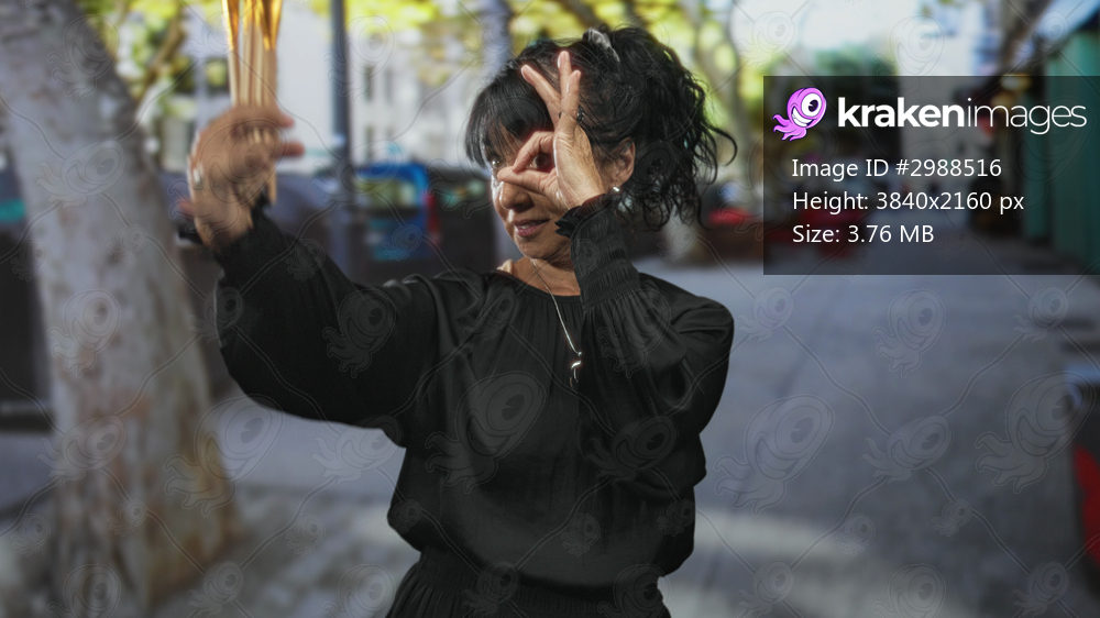 Senior hispanic woman in black dress holding makeup brushes and smiling makes ok sign with fingers over eye on a city street; joy beauty confidence.